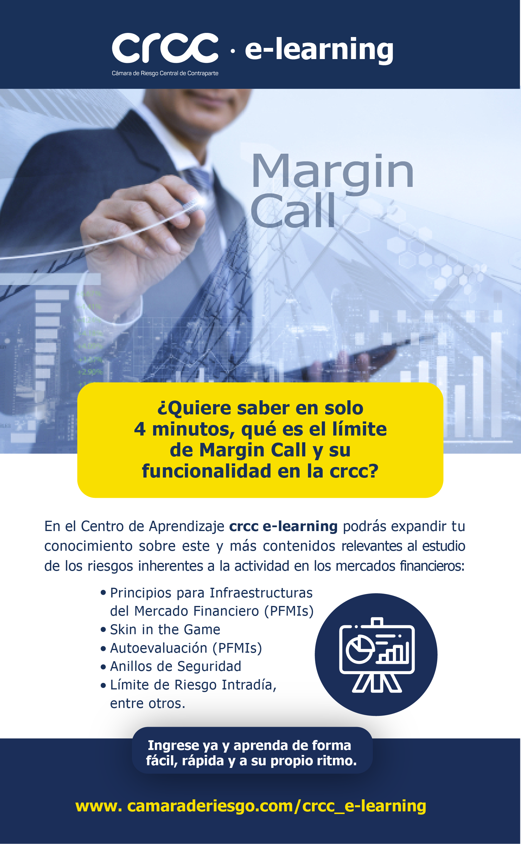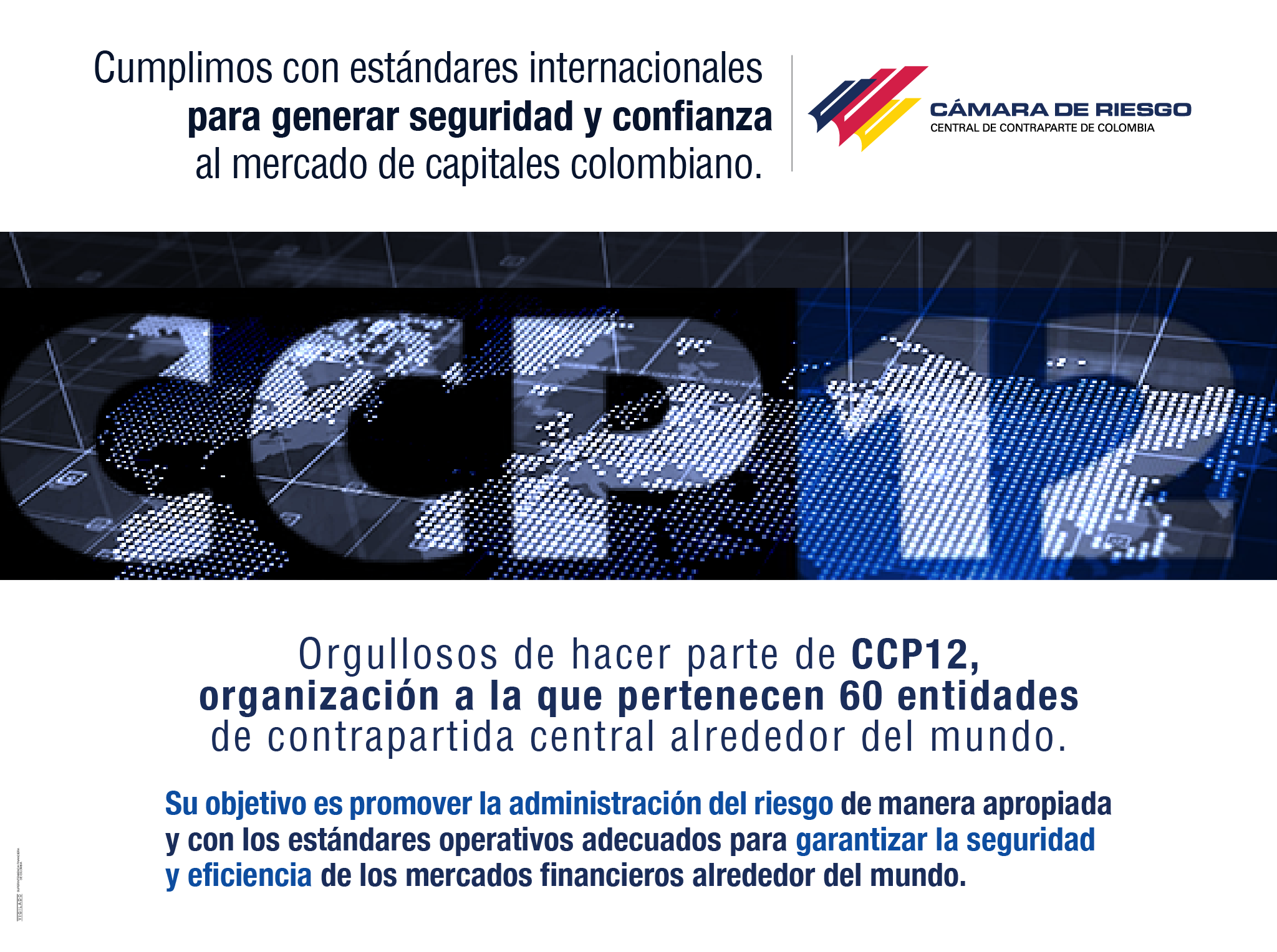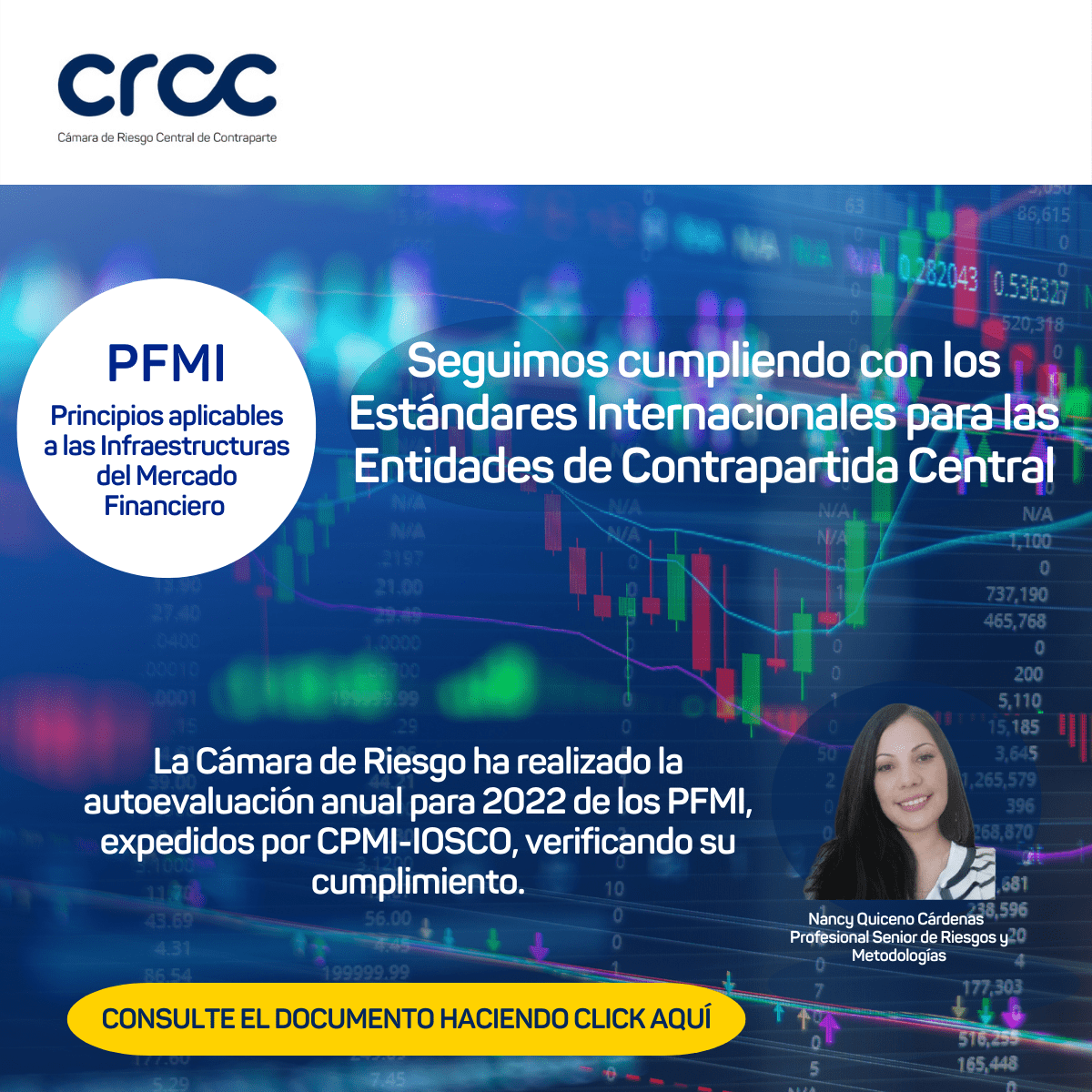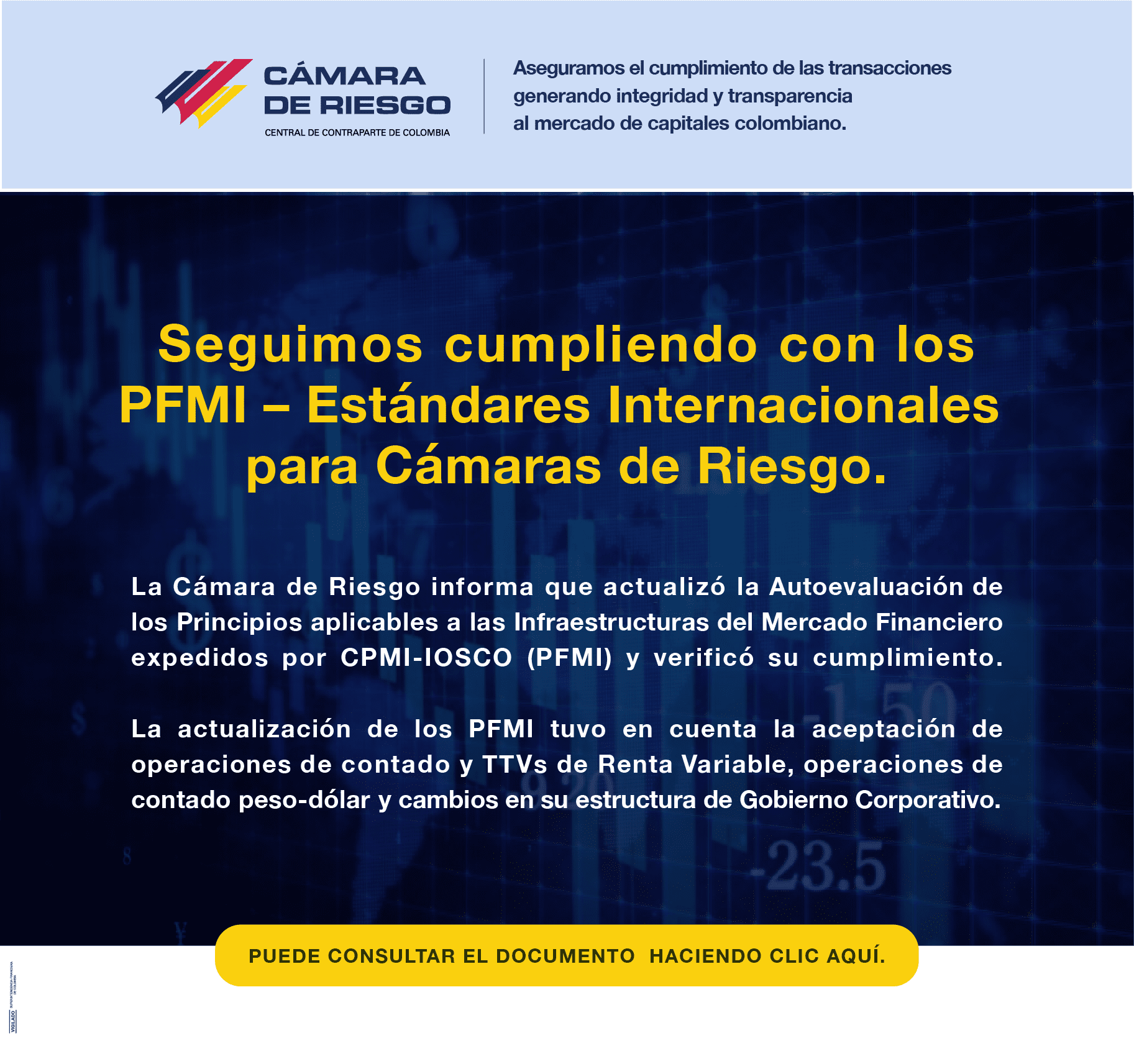 La Cámara de Riesgo informa que ha publicado en su página web el documento: Autoevaluación de la Cámara de Riesgo Central de Contraparte de Colombia S.A. – CRCC S.A. sobre el Cumplimiento de los Principios Para las Infraestructuras del Mercado Financiero: Marco de Divulgación y Metodología de Evaluación.