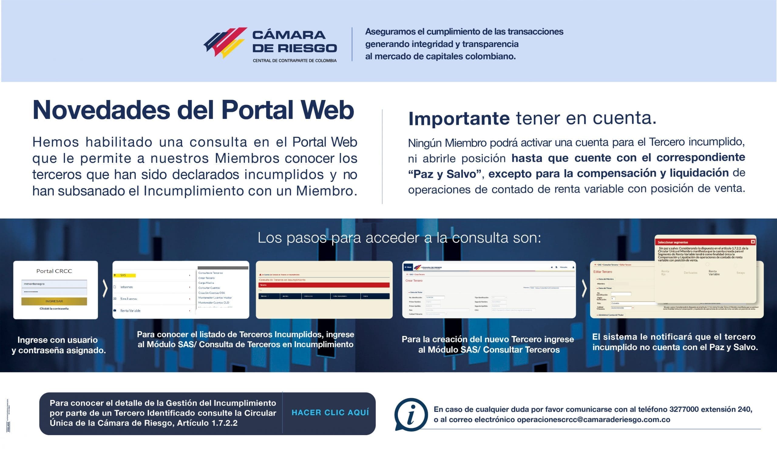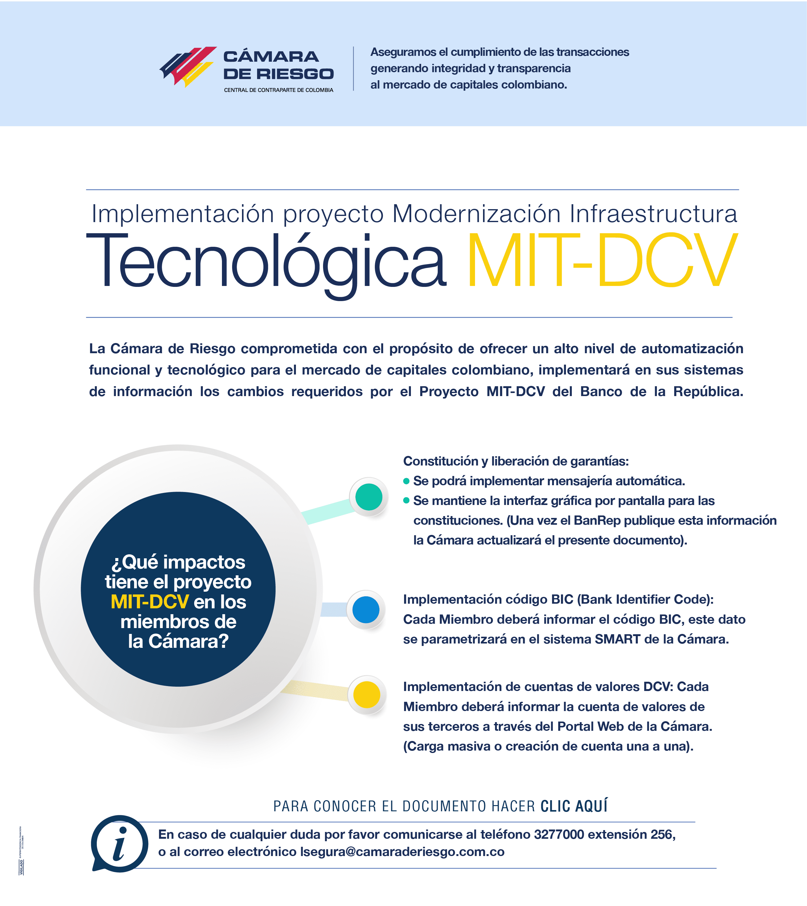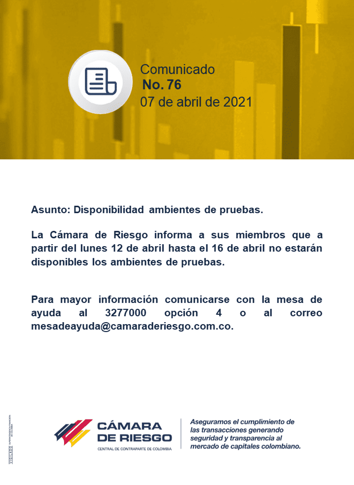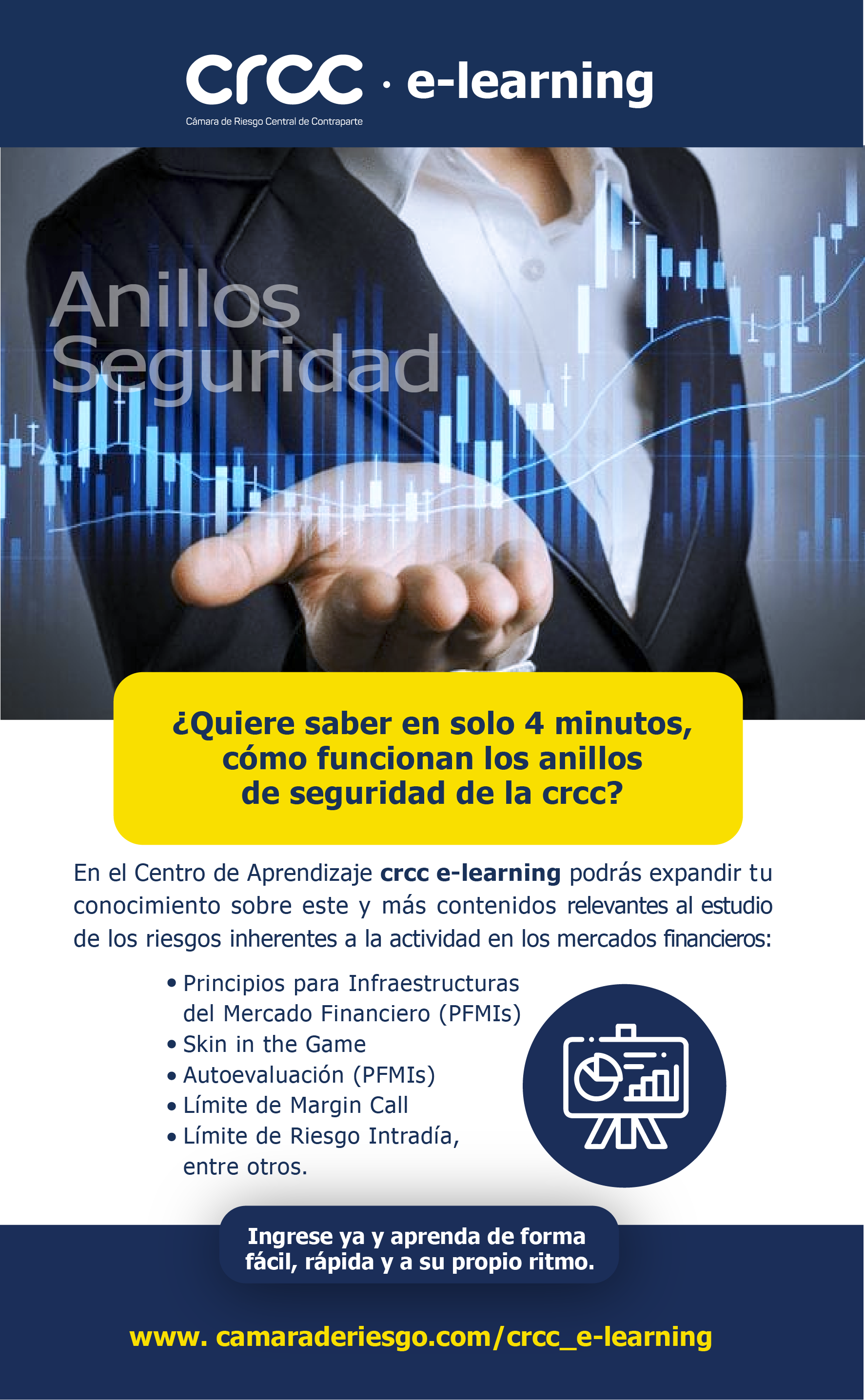 La Cámara de Riesgo informa que ha publicado en su página web el documento: Autoevaluación de la Cámara de Riesgo Central de Contraparte de Colombia S.A. – CRCC S.A. sobre el Cumplimiento de los Principios Para las Infraestructuras del Mercado Financiero: Marco de Divulgación y Metodología de Evaluación.