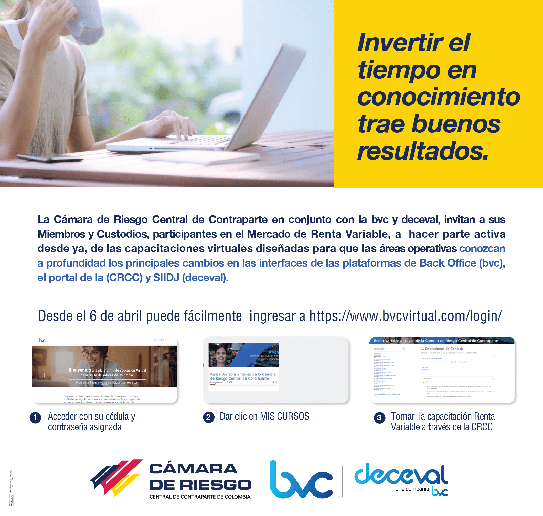 La Cámara en conjunto con la bvc y deceval, invitan a sus Miembros y Custodios, participantes en el Mercado de Renta Variable a hacer parte activa de las capacitaciones virtuales