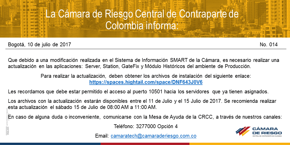 Por medio de la cual se informa que debido a una modificación realizada en el Sistema de Información SMART de la Cámara, es necesario realizar una actualización en las aplicaciones: Server, Station, GateFix y Módulo Históricos del ambiente de Producción.