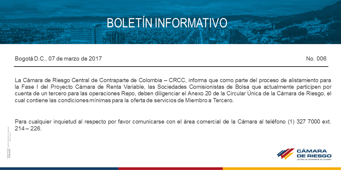La Cámara de Riesgo Central de Contraparte de Colombia – CRCC, informa que como parte del proceso de alistamiento para la Fase I del Proyecto Cámara de Renta Variable, las Sociedades Comisionistas de Bolsa que actualmente participen por cuenta de un tercero para las operaciones Repo, deben diligenciar el Anexo 20 de la Circular Única de la Cámara de Riesgo, el cual contiene las condiciones mínimas para la oferta de servicios de Miembro a Tercero.